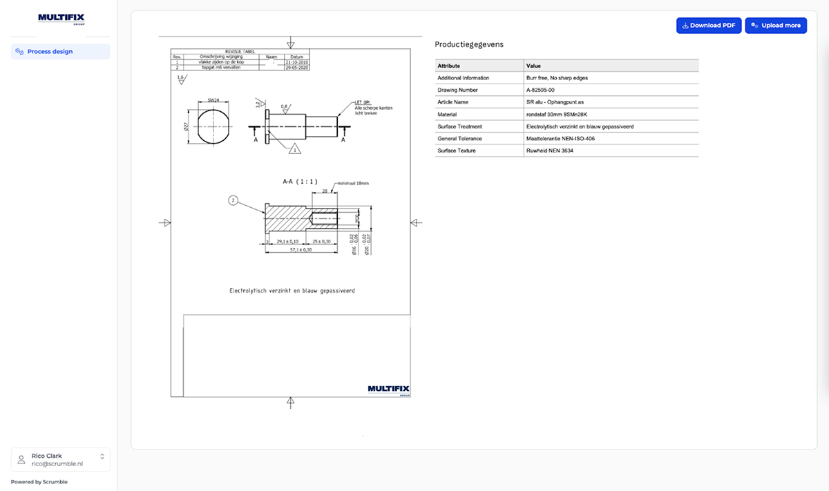 Multifix stond voor een dubbele uitdaging die hun groeiambitie op de proef stelde. Enerzijds vergde het verwerken van technische tekeningen in hun bestaande high-mix-high-volume business enorm veel handmatig werk: per tekening 30 tot 45 minuten, goed voor ruim 1,5 FTE administratieve belasting per dag. Dat beperkte niet alleen de schaalbaarheid, maar vormde ook een aanzienlijke kostenpost en operationeel risico door de handmatige verwerking.